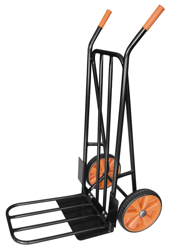 Sækkevogn med kraftigt 25 mm rørstel, udfaldsramme og håndtag med softgrip Maks. belastning: Fastplade midtpunkt 200 kg Udfaldsramme midtpunkt 70 kg Total højde: 108 cm Total bredde: 50 cm Akseldiameter: 19 mm Vægt: 10,5 kg Udfaldsramme: 36×50 cm Fast plade: 40×22 cm Punktérfri hjul: Dækstørrelse: Ø250×45 mm Fælg: stål med kuglelejer Sækkevognen er forsynet med kraftig udfaldsramme til nem håndtering af lasten samt punktérfri hjul monteret på ABS-fælge Alt stål er sandblæst og grundbehandlet før den endelige pulverlakering