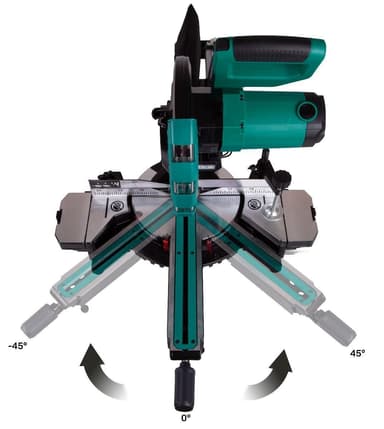 Du kan hurtigt indstille vinkler med forudindstillede geringsvinkler (0°, 15°, 22.5°, 30°, 45°) eller justere dem trinløst. Den medfølgende 60T savklinge er ideel til både hurtige og fine snit i træ, laminat, parket og byggeplader.