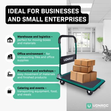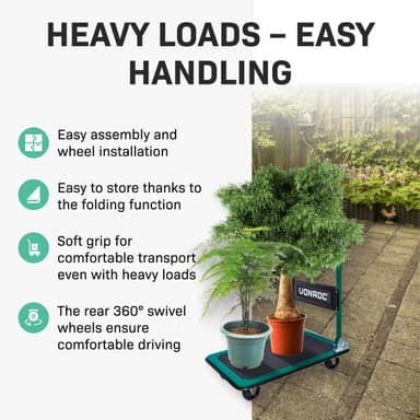 Skal du flytte tunge og store genstande? Med VONROC TT502XX foldbar platformsvogn bliver transporten nem og effektiv. Den robuste vogn har en maksimal belastning på 150 kg, og de 360° drejelige gummihjul giver dig fuld kontrol og manøvredygtighed.