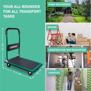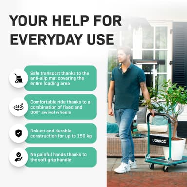 Platformen er udstyret med anti-slip belægning og beskyttende gummikant, så din last står sikkert. Håndtaget har blødt greb for komfort, og vognen kan nemt foldes sammen med fodbetjent mekanisme – perfekt til opbevaring og transport.
