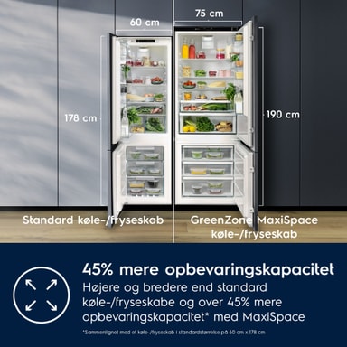Takket være MaxiSpace får du 45% mere opbevaringsplads end med et standard køle-/fryseskab.* Det er højere og bredere end almindelige køleskabe og har ekstra plads til at opbevare flere madvarer. *Sammenlignet med vores køle-/fryseskab i standard størrelse