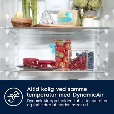 DynamicAir sikrer en stabil temperatur indvendigt i køleskabet. Den lader kold luft cirkulere i køleskabet, så maden beskyttes mod opvarmning, selv når døren står åben.