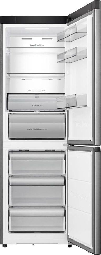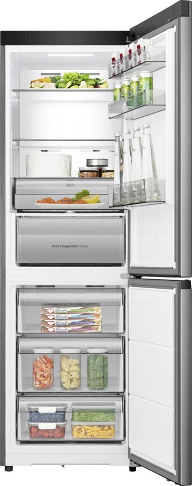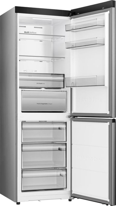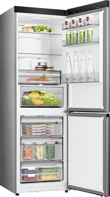 Hisense RB3K330SEIE fritstående køle-/fryseskab i rustfrit stål er designet til at kombinere moderne design, praktisk madopbevaring og langvarig friskhed. Med en flad pasform, smart interiør og førsteklasses køling er det skabt til køkkener, hvor plads og ydeevne er afgørende.
