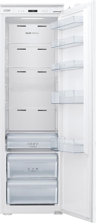 Logik køleskabet LTR177I25E er et indbygget højt køleskab med et rumfang på 300 liter, designet til effektiv og praktisk opbevaring af fødevarer. Det har et Multi Air Flow-system til jævn køling i hele skabet. Stille drift på kun 35 dB sikrer minimal støjforstyrrelse.