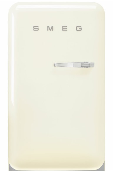 Smeg FAB10LCR6 køleskab i 50'er stil, cremefarvet, har 105L kapacitet, 35 dB, LED-lys, venstrehængslet dør. Ideel til små rum med justerbar hylde og grøntsagsskuffe.Læs mere om produktet