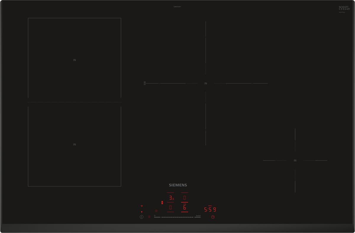 Siemens kogeplade ED851HSB1E: 80 cm, 4-zoner kogeplade med CombiZone, multitouch-kontrol og Home Connect for smart, effektiv madlavning.Læs mere om produktet