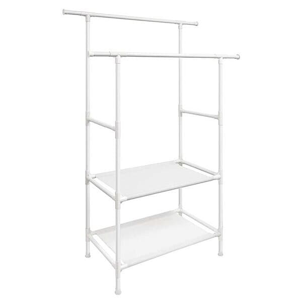 Tøjstativ med 2 bøjlestænger og 2 opbevaringshylder i hvidt metal