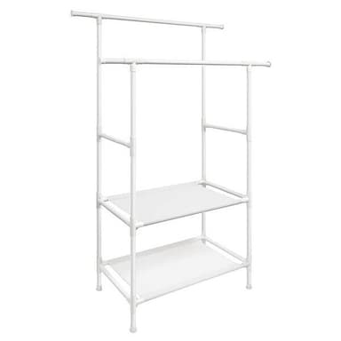 Tøjstativ med 2 bøjlestænger og 2 opbevaringshylder i hvidt metalLæs mere om produktet