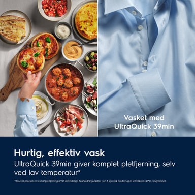 UltraQuick 39min er et mere energivenligt* og kraftfuldt program, som er optimeret til tøjvask i hverdagen. Det fjerner alle pletter fra dit vasketøj med blandede tekstiler, som bomuld og syntetiske materialer, ved lave temperaturer (30°C) og på kort tid (39 min.).** 1. *Baseret på ekstern test af pletfjernelse på 50 almindelige husholdningspletter med programmet UltraQuick 30°C og en mængde på 5 kg. **Baseret på intern test, der sammenlignende bomuldsprogrammets energiforbrug ved 40°C med UltraQuick-programmet på 39 min. ved 30°C 2. *Baseret på intern test, der sammenlignede energiforbruget for bomuldsprogrammet ved 40°C med UltraQuick-programmet på 39 min. ved 30°C. **Baseret på ekstern test af pletfjernelse på 50 almindelige typer husholdningspletter med UltraQuick-programmet ved 30°C og en mængde på 5 kg