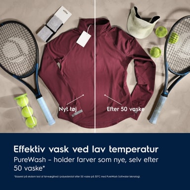 PureWash med Softwater teknologi renser hårdt vand og giver en effektiv vask, selv ved lavere temperaturer. PureWash holder også farverne friske, selv efter 50 vaske*, og hjælper med at beskytte tøjets facon.** *Baseret på ekstern test af farveægthed på polyester efter 50 vaske ved 30°C med PureWash Softwater teknologi. **Baseret på intern test, hvor bomuldstøj krympede mindre ved vask med PureWash Softwater- teknologi med hårdt vand på et bomuldsprogram sammenlignet med ufiltreret hårdt vand.