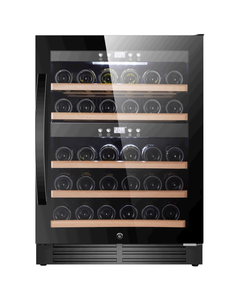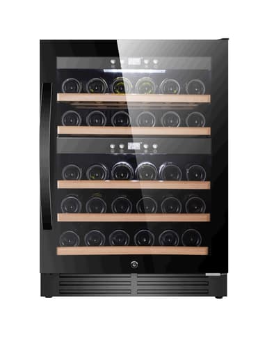 Moderne og stilrent vinkøleskab til indbygning, med en låsbar dør og håndtag og sokkel i et flot sort design. To temperaturzoner og hylder af træ skaber de perfekte forudsætninger for at opbevare din vin på en flot og effektiv måde.Læs mere om produktet
