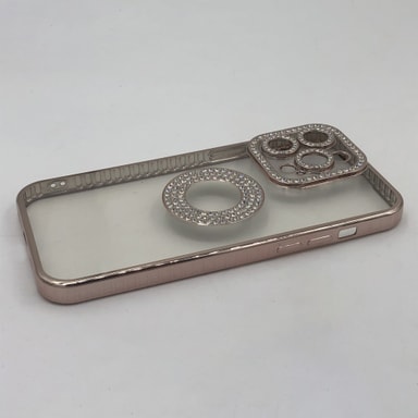 Stilfuld gennemsigtig skal med rosa guldkant og dekoration af funklende rhinsten. Giver din flotte iPhone 14 Pro Max et ekstra luksuriøst look, mens mobilcoveret beskytter mod ridser og andre skader.