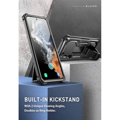 Mobilcoveret har en integreret stander, der kan foldes ud efter behov. Der medfølger også en praktisk bælteholder, der gør det muligt at fastgøre coveret til bæltet.