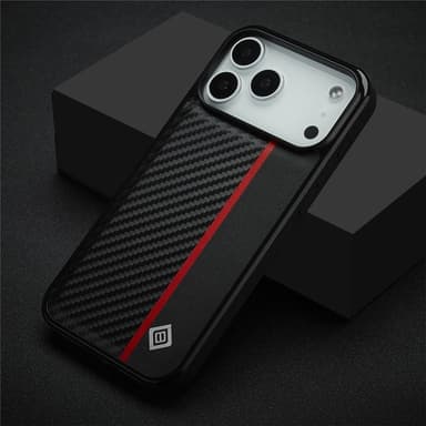 TPU + EVA 2-i-1 hybrid bundkasse, holdbar og ridsefast. Overflade i kulfiberstruktur og PU-læder med fin tekstur og rød lodret stribe, stilfuldt look. Aluminiumlegeringslogoet viser den høje kvalitet.