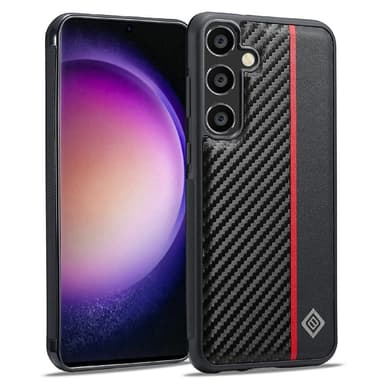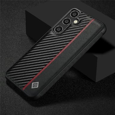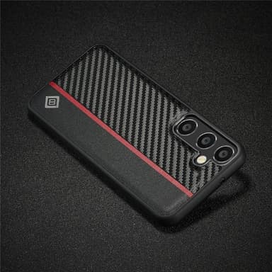 TPU + EVA 2-i-1 hybrid bundkasse, holdbar og ridsefast. Overflade i kulfiberstruktur og PU-læder med fin tekstur og rød lodret stribe, stilfuldt look. Aluminiumlegeringslogoet viser den høje kvalitet.