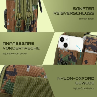 Cadorabos taktiske mobiltaske i camouflage er perfekt til udendørsentusiaster. Med en højde på 185 mm og en bredde på 125 mm giver den plads til smartphones på op til 6,7 tommer. Den er ideel til vandreture, camping, jogging og andre udendørs aktiviteter og holder dine vigtigste ting sikre og lige ved hånden.
