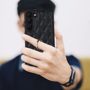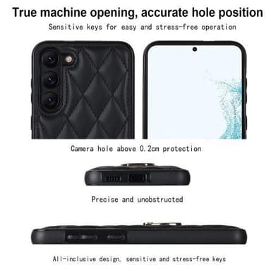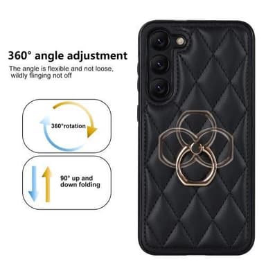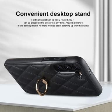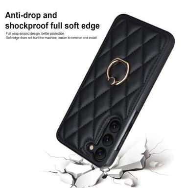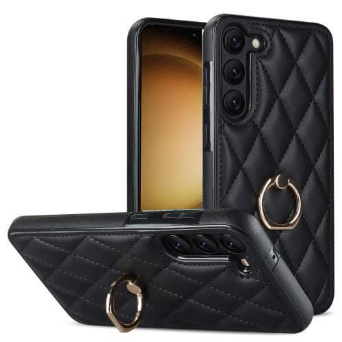 Til Samsung Galaxy S23 telefonetui PU-læder+TPU-præget rhombusgittermønster Bagcover med ringstativ - sort Konstru eret med TPU-materiale belagt med PU-læder, ridsefast og fingeraftryksfri Rhombus-prægning struktureret design, delikat og stilfuldt DeLæs mere om produktet