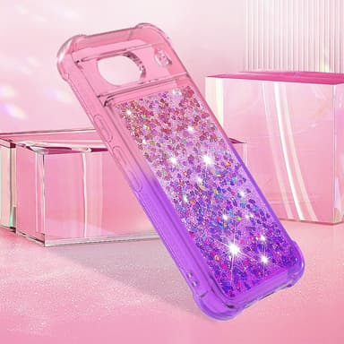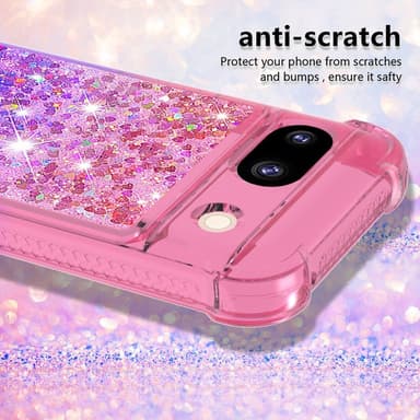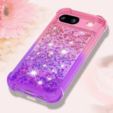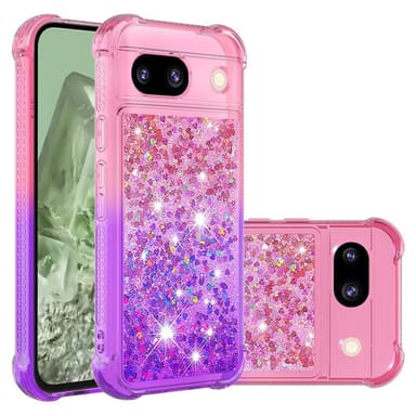 En TPU-cover med flydende væske med glitter og hjerter, der beskytter godt mod stød og faldskader.
