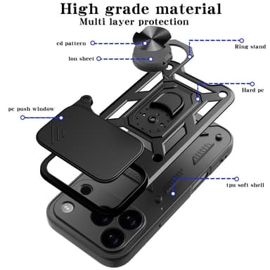 Oplev ultimativ beskyttelse og funktionalitet med Armor Metal Ring Kameraskyder. Dette cover er designet til at give din telefon et elegant udseende, samtidig med at det beskytter mod hverdagens udfordringer. Den indbyggede roterbare ring gør det nemt at bruge telefonen med én hånd og justere betragtningsvinklen, mens den magnetiske holders kompatibilitet sikrer stabil placering i bilen.