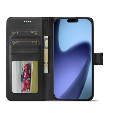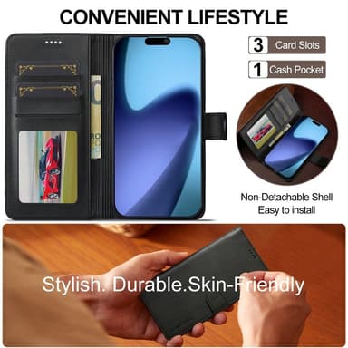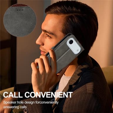 Dette stilfulde cover er fremstillet af PU-læder med kalvestruktur og TPU-materiale, hvilket giver en blød fornemmelse og elegant finish. Det giver 360 graders beskyttelse og kombinerer funktionalitet med æstetik. Med to kortlommer, en fotolomme og et kontantrum kan du lade pungen blive hjemme. Det foldbare stativ giver justerbare vinkler til håndfri visning, og den stærke magnetlukning holder telefon, penge og kort sikkert på plads. Et reserveret hul til højtaleren gør det muligt at tale med coveret lukket.