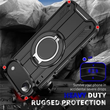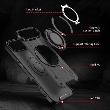 Dette mobilcover er fremstillet af hård PC og blød TPU, hvilket giver en ideel kombination af holdbarhed og fleksibilitet. Den indbyggede 360° roterende ring fungerer som et praktisk stativ til håndfri visning, perfekt til videoer og videoopkald. Den magnetiske ring gør det nemt at bruge med MagSafe-opladere og magnetiske holdere, både hjemme og i bilen. Luftpudedesignet giver effektiv stødabsorbering ved fald og beskytter din enhed. Let at montere og fjerne uden risiko for skader.