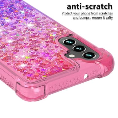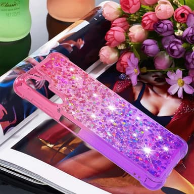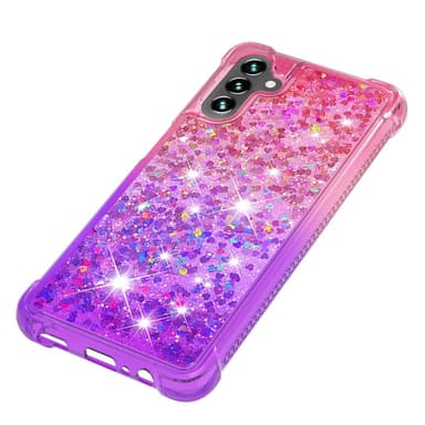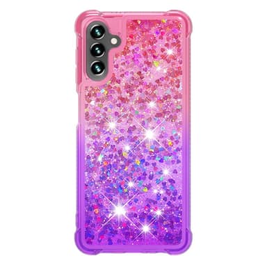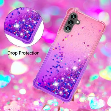 En TPU-cover med flydende væske med glitter og hjerter, der beskytter godt mod stød og faldskader.