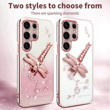 Giv din telefon et touch af elegance med dette KADEM Dragonfly Glitter cover. Det glitrende cover med indbygget stativ giver både stil og funktion. Nyd handsfree-visning med det praktiske stativ, mens det smukke design med evighedsblomst og rhinsten løfter din telefons udseende.