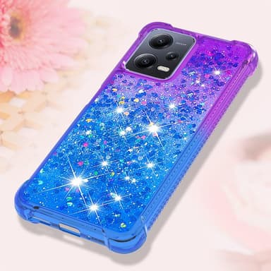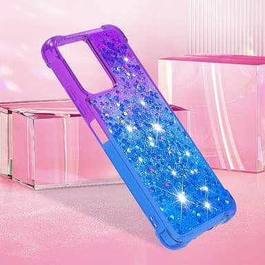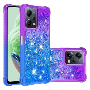 En TPU-cover med flydende væske med glitter og hjerter, der beskytter godt mod stød og faldskader.