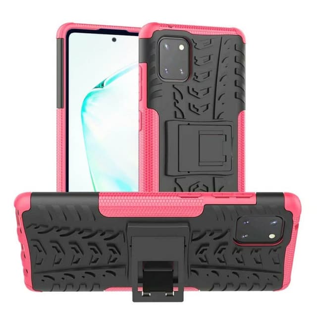 Mobildæksel bestående af to lag, dvs. et TPU-låg (silikone) og et plastikafdækning med et indbygget stativ til fx filmvisning.