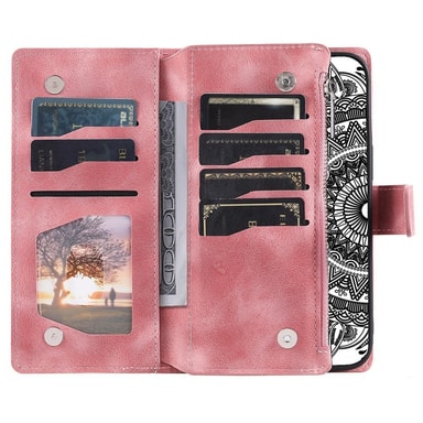 【Premiummateriale】 Dette telefoncover er lavet af premium PU-læder med TPU-interiør og tilbyder en behagelig berøring og stabil beskyttelse 【Fashionabelt design】 Præget med et elegant mandalablomstmønster tilføjer dette etui et unikt og moderigtigt touch til din telefon 【Pungfunktionalitet】 Designet med flere kortpladser, en kontantholder og en lynlåslomme gør dette etui det nemt at bære vigtige kort, mønter og kontanter 【Håndfrit stativ】 Etuiet kan foldes sammen til et stativ, perfekt til håndfri brug, mens du ser videoer eller videochatter 【Sikker magnetisk lukning】 Med en magnetisk trykknap sikrer dette etui, at din telefon, penge og kort opbevares sikkert 【Komfortabel håndledsrem】 Udstyret med en håndledsrem er dette etui let at bære og sikrer, at din telefon altid er inden for rækkevidde