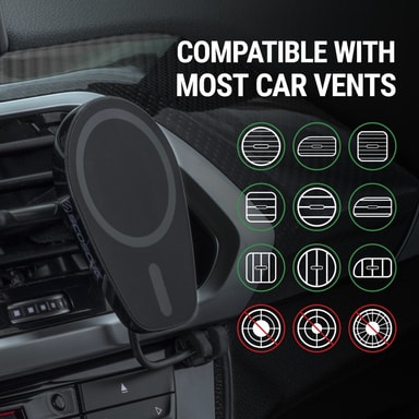 Denne trådløse Qi holder er perfekt til brug med Qi-aktiverede smartphone enheder og iPhone 12 eller nyere med en MagSafe (uden brug af magicPLATE) til fastgørelse af telefonen til holderen og oplade den trådløst. For ikke MagSafe-enheder eliminerer det vuggefrie design behovet for at stramme rundt om din enhed - bare hold din smartphone nær den magnetiske overflade, og den låses sikkert på plads. De ekstra kraftige N50 neodymmagneter er 30% stærkere end de originale magicMOUNTs for at holde din mobiltelefon sikkert på plads på selv de mest ujævne veje og er stadig 100% sikker for alle moderne smartphones.