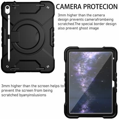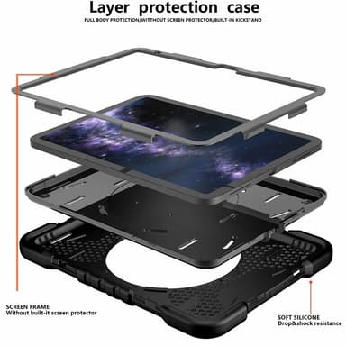 Dette ekstra stødsikre cover er fremstillet af PC- og silikone-materiale og giver en komplet beskyttelse til din tablet. Forstærkede hjørner beskytter effektivt mod stød og fald, mens præcise udskæringer giver nem adgang til højttalere, mikrofoner, opladningsporte og andre tilslutninger. Den integrerede 360-graders roterende standerfunktion gør det nemt at se indhold både vandret og lodret uden at holde enheden. Den justerbare skulderrem gør det bekvemt at bære tabletten med sig overalt, samtidig med at den beskyttes med stil.