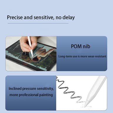 Touch pen til kapacitive skærme på tablets som iPad, iPad Mini, iPad Air og iPad Pro. Spidsen kan udskiftes, 4 skrivespidser medfølger. Oplader med medfølgende USB-C kabel.Læs mere om produktet