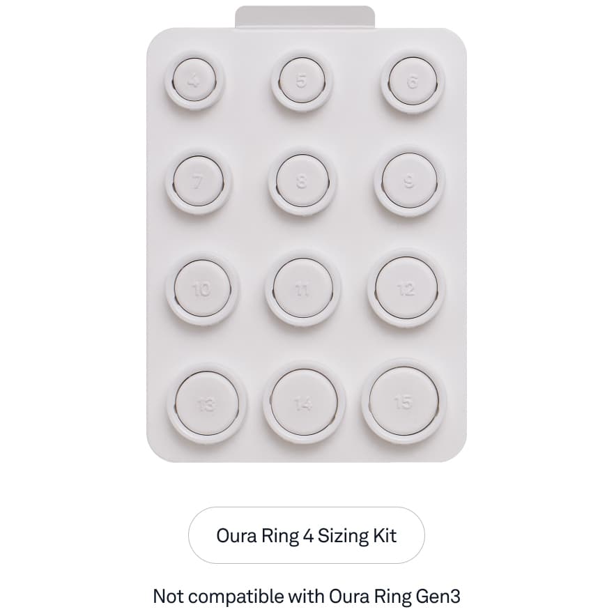 Takket være Oura Ring 4 størrelsessættet kan du finde din perfekte størrelse. Sættet indeholder størrelserne 4 til 15, så du kan teste og finde den ringstørrelse, der passer til din pege-, lang- eller ringfinger. Hvert sæt leveres med en kuponkode.Læs mere om produktet