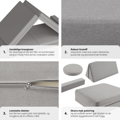 Børnesofaen Lilly er mere end bare en sofa – det er et kreativt legemøbel, der er perfekt til at bygge, tumle og slappe af. De modulære elementer kan altid arrangeres på ny og giver dit barn utallige muligheder for at skabe sine egne legeverdener. Uanset om det er som gymnastiksofa, mini-sofa eller sovesofa – Lilly tilbyder ubegrænset sjov og fremmer fantasien.