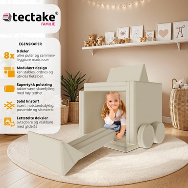 Børnesofaen Lilly fra tectake er den perfekte tilføjelse til ethvert børneværelse. Med sit modulære design tilbyder det uendelige muligheder for at fremme fantasi og kreativitet. Takket være de otte enkelte elementer, herunder forskellige puder og to store madrasser, kan sofaen fleksibelt stables, arrangeres og udvides. Uanset om det er til leg, afslapning eller søvn – tilpasser børnesofaen Lilly sig altid til dit barns behov.