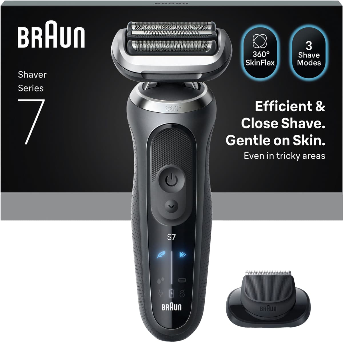 Braun Series 7 barbermaskine 72-G1200s giver en tæt barbering med sit fleksible 360° hoved, tre barberingstilstande og op til 60 minutters ledningsfri brug. Den er vandtæt og leveres med en præcisionstrimmer til detaljeret trimning.Læs mere om produktet