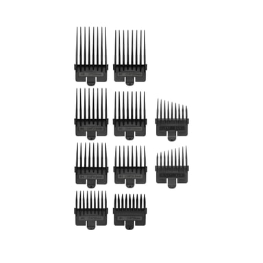 Komplet med 8 afstandskamme, 0,8-25 mm, samt afstandskamme til venstre og højre øre til variable klippelængder.