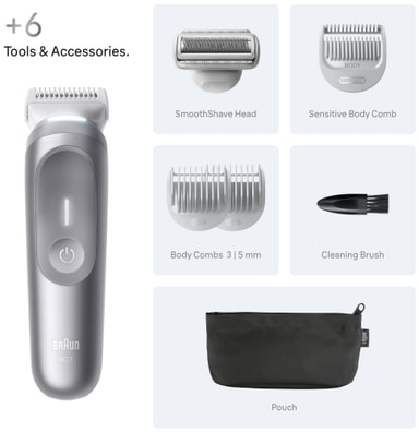 Braun Series 7 kropstrimmeren kommer med alt, hvad du behøver for en præcis og behagelig trimning. I pakken finder du kropstrimmeren, tre kamme til forskellige længder og et tilbehør til detaljeret trimning. En praktisk pose holder alt organiseret, mens den medfølgende rensebørste sikrer nem vedligeholdelse.