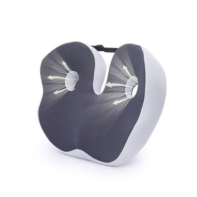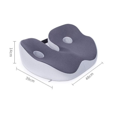 Specifikationer - Materiale: Polyester + Memory Foam - Størrelse: 48 x 39 x 14 cm - Farve: Grå/hvid - Funktion: Ergonomisk støtte til ryg og hofter - Type: Ortopædisk siddepude