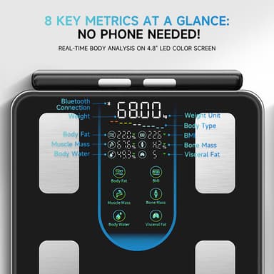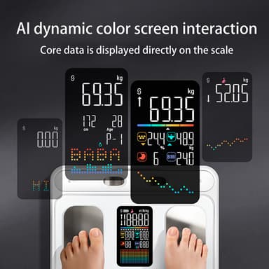 Brugervenlig app-integration: Tilslut vægten problemfrit til din smartphone via Bluetooth, og synkroniser dine data til den brugervenlige app. Appen giver klare og letforståelige visualiseringer af dine fremskridt over tid. Spor dine mål for vægttab eller muskelvækst, indstil påmindelser, og del dine resultater med venner og familie. Appen gemmer dine historiske data, så du kan identificere tendenser og mønstre i din kropssammensætning. LED-farveskærmen på selve vægten viser også vigtige målinger for hurtige og bekvemme aflæsninger.