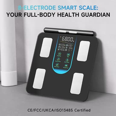 Omfattende kropsanalyse: Denne smarte kropsfedtvægt bruger avanceret bioelektrisk impedansanalyse (BIA) teknologi med 8 elektroder til at give en omfattende analyse af din kropssammensætning. Den måler ikke kun din vægt, men også kropsfedtprocent, muskelmasse, vandprocent, knoglemasse, visceralt fedt, basalstofskifte (BMR) og mere. Få et komplet billede af dit helbred og fitnessniveau med 45 professionelle målerapporter tilgængelige via den dedikerede app. Denne detaljerede indsigt giver dig mulighed for at spore dine fremskridt og træffe informerede beslutninger om din kost og træningsrutine.