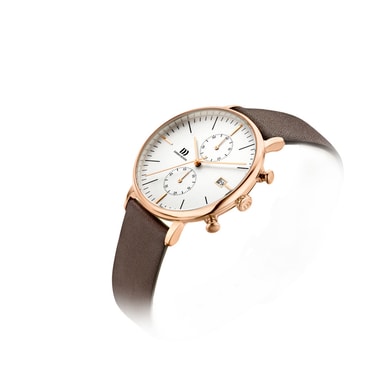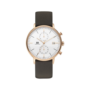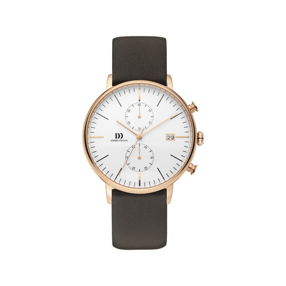 Få komplet kontrol over tiden med dette mesterværk. Dette smukke kronograf ur fra danish design har en 42mm guldfarvet kasse i rustfrit stål med en hvid skive, mineral krystal glas og en brun læderrem.