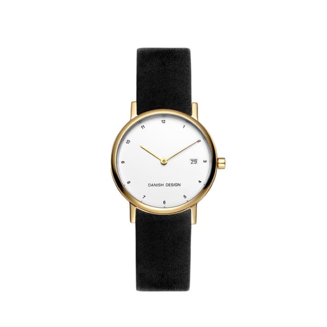 Smukke og stilfulde ure der komplimenterer ethvert outfit, er hvad danish design handler om. Uret har en guldfarvet kasse i titanium med hvid skive, datodisplay, mineral krystal glas og en sort læderrem.