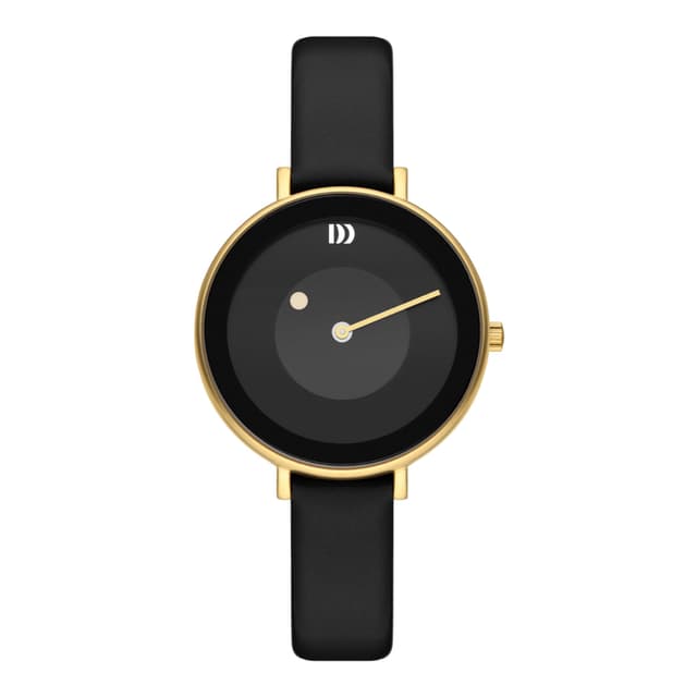 Et perfekt match til ethvert outfit og enhver dag. Dette danish design ur har en guldfarvet kasse i rustfrit stål med sort urskive, mineralsk krystalglas og sort læderrem. Kasse størrelse: 35mm. Vandafvisende: 3 atm.