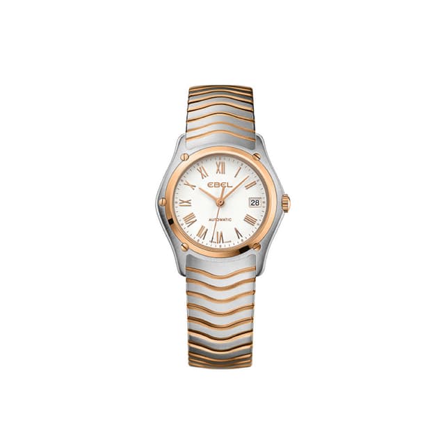 Ebel classic dame ur, rustfrit stål og 18k guld kasse, ø 27.3mm, hvid skive med påsatte markører, safir krystal glas, to-tonet rustfrit stål wave-link armbånd, schweizisk quartz urværk, vandafvisende op til 50 meter og datodisplay.