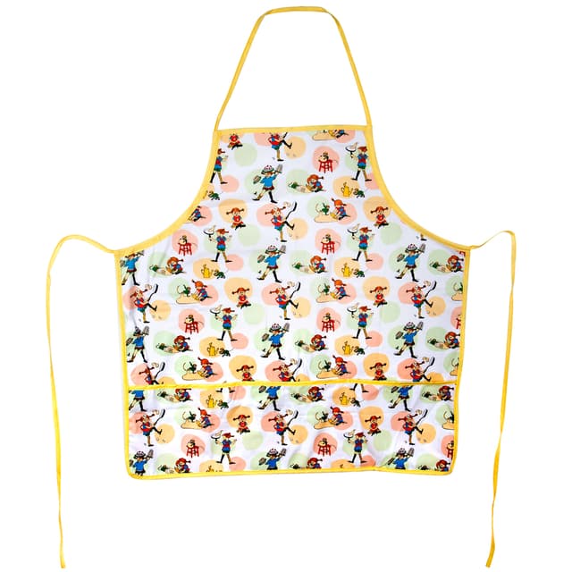 Förklädet har gula kantband och knytband och det är helmönstrat med fina bilder av Pippi som bakar.