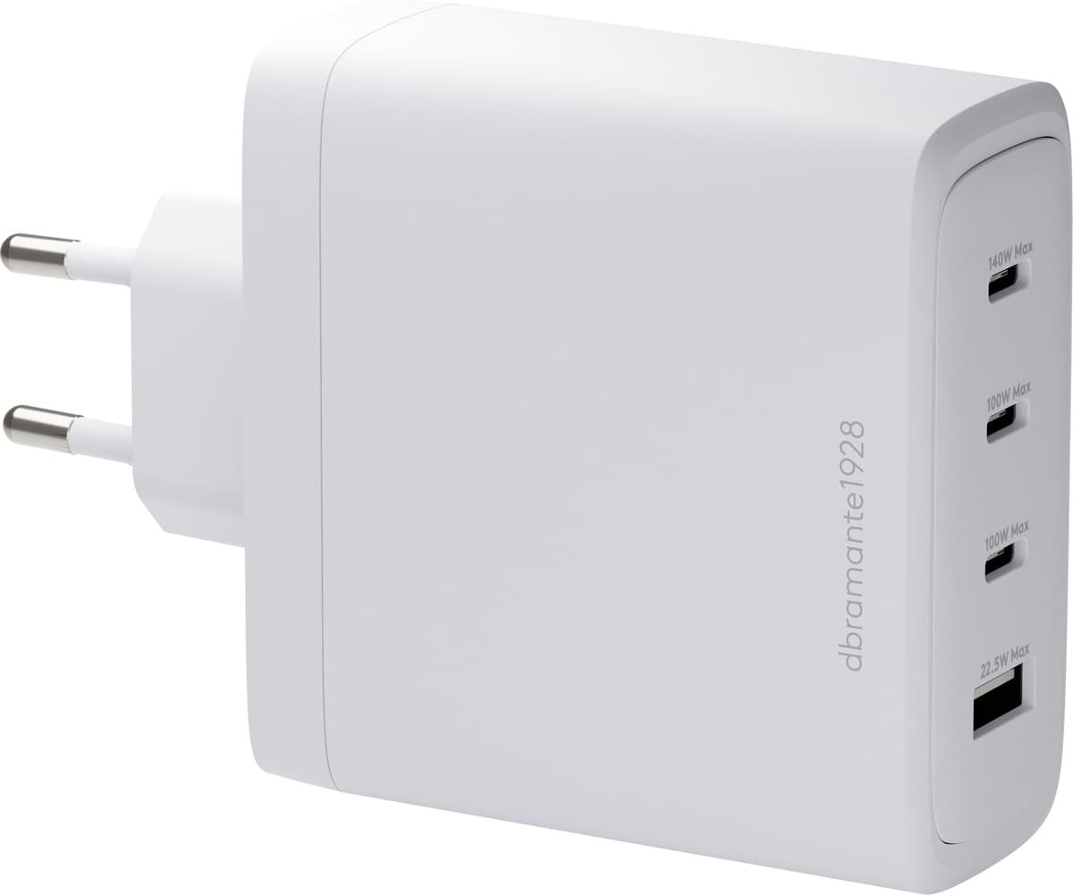 dBramante 140W vægopladeren leverer miljøvenlig, kraftfuld opladning med GaN-teknologi, 3 USB-C, 1 USB-A porte, intelligent strømtilpasning, overspændingsbeskyttelse og hurtigopladning til enheder som MacBook Pro i et kompakt, genanvendeligt design.Læs mere om produktet