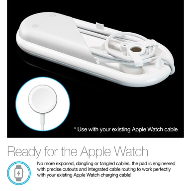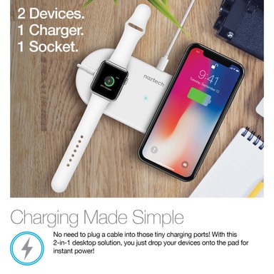 Med denne mobil oplader station får du en 2-i-1 løsning fra Naztech, hvor du kan oplade din enhed trådløst samtidigt med, at du lader dit Apple ur. Din originale lader til dit Apple watch passer perfekt i holderen. Begge enheder oplades samtidigt med kun brug af én enkelt stikkontakt.