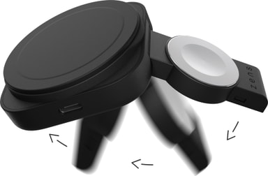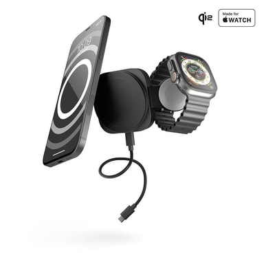 Qi2- eller MagSafe-kompatibel telefon oplades i liggende tilstand med brug af støttebenet. Travel Charger Pro 2 er fuldt kompatibel med alle Apple Watch, inklusive Apple Watch Ultra.Læs mere om produktet